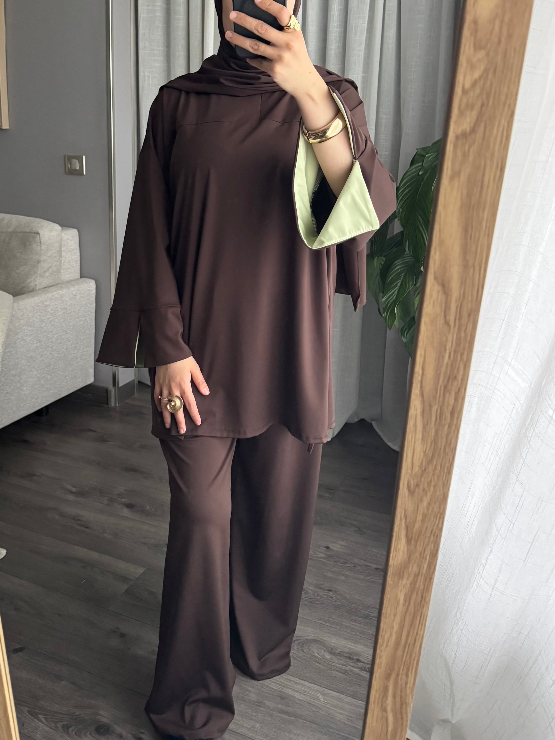 3-teiliges Burkini-Set im modernen und bequemen Stil, gedacht für optimale Bewegungsfreiheit. Die weite Passform sorgt für idealen Schutz, während es leicht und angenehm zu tragen bleibt. Die leicht ausgestellten Ärmel mit Kontrast verleihen einen eleganten und originellen Akzent.