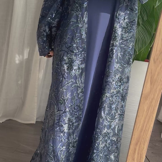 Abaya élégante composée d’un kimono en tulle délicatement perlé à la main avec sequins et d’une sous-robe à manches longue satiné pour un rendu raffiné et confortable. Une pièce idéale pour les occasions et soirées spéciales.
